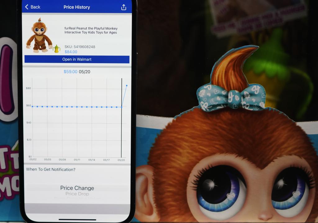 5月21日,在美國舊金山灣區(qū)圣利安卓San Leandro的一家沃爾瑪超市,價格跟蹤軟件(Walmart Tracker)顯示商品(中國產(chǎn)毛猴玩具)售價變化。新華社記者吳曉凌攝