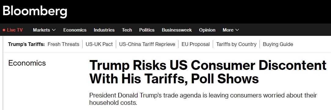 彭博社近日民調顯示,56%的受訪美國人認為,特朗普對其他國家征收的關稅對他們的家庭財務狀況產(chǎn)生了不良影響。即使特朗普政府一直在鼓吹加關稅能讓產(chǎn)業(yè)回流美國并增加財政收入,約52%的受訪者還是表示,美政府承諾的好處不值得他們?yōu)榇烁冻龅慕?jīng)濟代價。