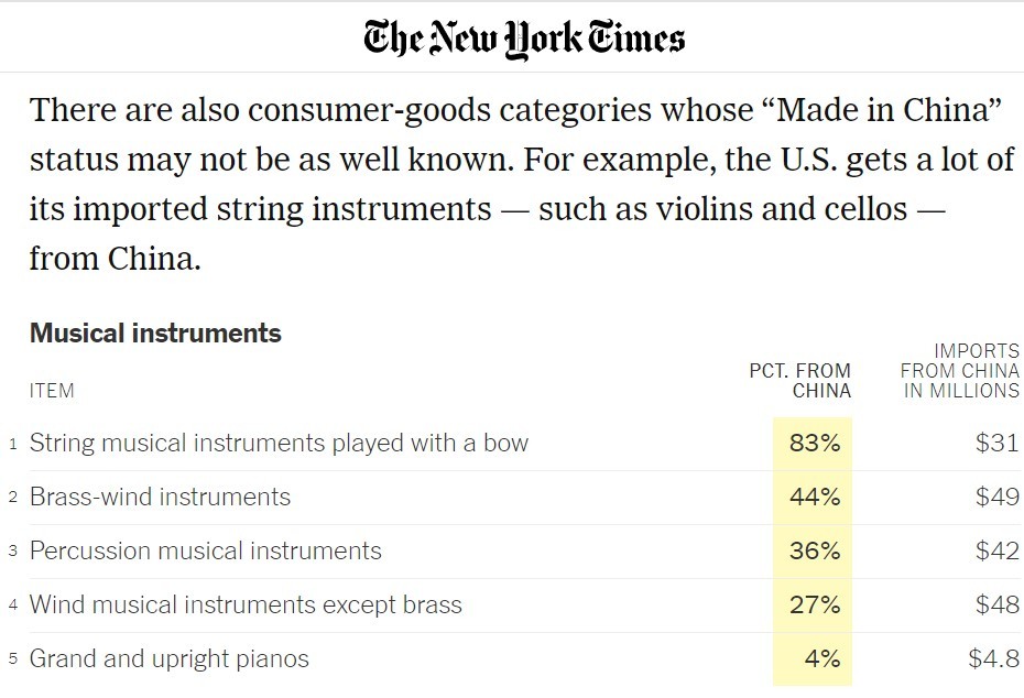 文章說(shuō),從清單中可以看出,美國(guó)從中國(guó)進(jìn)口的主要商品都是消費(fèi)品,覆蓋生活中的多個(gè)場(chǎng)景:你衣櫥中的領(lǐng)帶、手套和連褲襪幾乎都是從中國(guó)進(jìn)口的;如果你是一名運(yùn)動(dòng)員,尤其是球類運(yùn)動(dòng)的運(yùn)動(dòng)員,那么你用的羽毛球、乒乓球、網(wǎng)球、健身房設(shè)備、泳池設(shè)備等都非常依賴“中國(guó)制造”;還有一些消費(fèi)品類別的“中國(guó)制造”可能不那么廣為人知。例如,美國(guó)從中國(guó)進(jìn)口了大量弦樂(lè)器,包括小提琴和大提琴。維生素及其衍生物也大量從中國(guó)進(jìn)口,還有各種冷凍魚類,包括鰻魚、鱈魚、羅非魚等等。