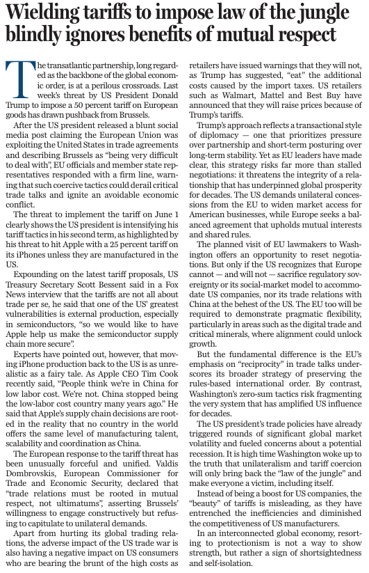此次,歐盟對(duì)關(guān)稅威脅的回應(yīng)異常有力。歐盟貿(mào)易專(zhuān)員瓦爾迪斯·多姆布羅夫斯基斯明確表示:“貿(mào)易關(guān)系必須根植于相互尊重,而非強(qiáng)制與脅迫”。他同時(shí)強(qiáng)調(diào),歐委會(huì)愿意進(jìn)行建設(shè)性接觸,但絕不向單邊措施屈服。