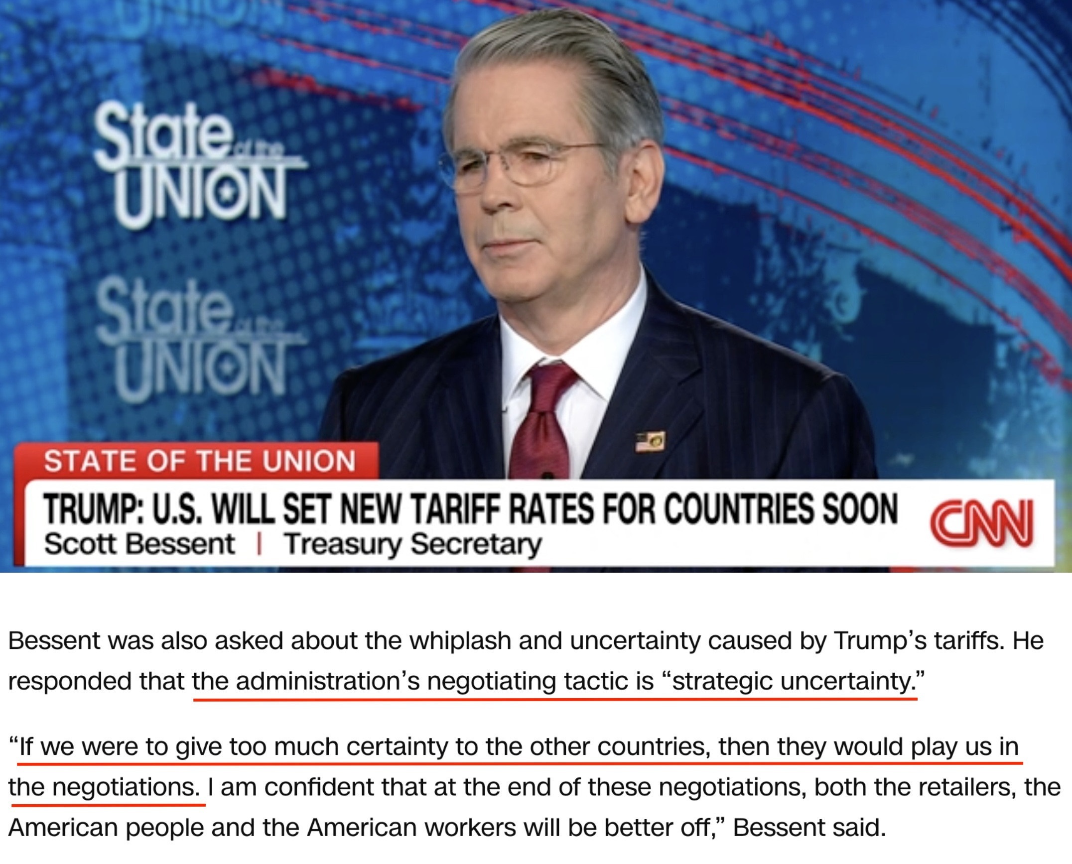 說到美國(guó)關(guān)稅的不確定性,美國(guó)財(cái)長(zhǎng)貝森特近日接受采訪時(shí)曾有過一番“高論”。據(jù)他稱,在美國(guó)與貿(mào)易伙伴展開關(guān)稅談判之際,美國(guó)政府表現(xiàn)出的“戰(zhàn)略不確定性”是一種談判策略,而非缺點(diǎn)。