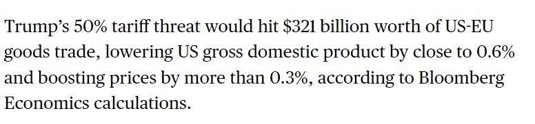 彭博社的計(jì)算結(jié)果顯示,50%的關(guān)稅將影響價(jià)值高達(dá)3210億美元的美歐商品貿(mào)易,一旦征收,將使美國(guó)國(guó)內(nèi)生產(chǎn)總值(GDP)下降近0.6%,物價(jià)上漲超過0.3%。