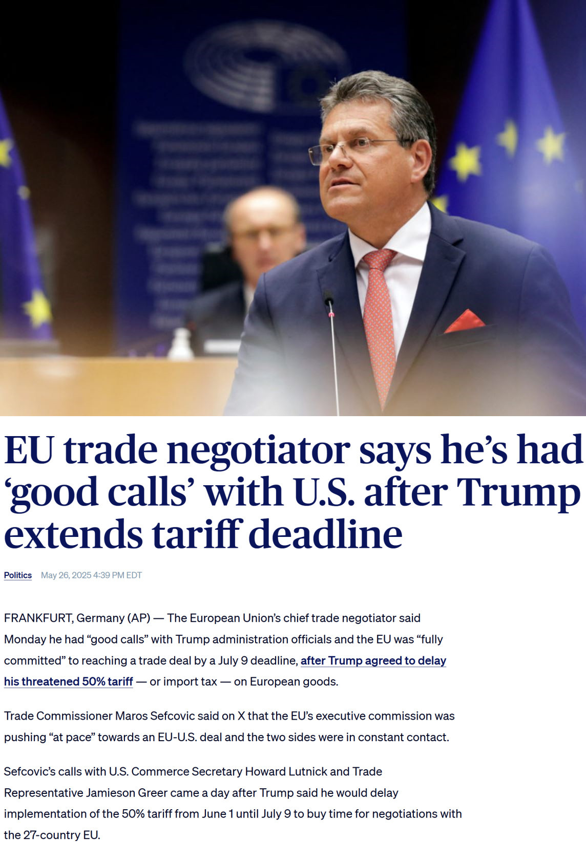 他25日告訴記者,自己當(dāng)天與歐盟委員會(huì)主席馮德萊恩“愉快”地通了電話,并應(yīng)對(duì)方要求,決定將原計(jì)劃從6月1日開始對(duì)歐盟加征的50%的關(guān)稅推遲到7月9日,以便雙方有時(shí)間就此進(jìn)行談判。