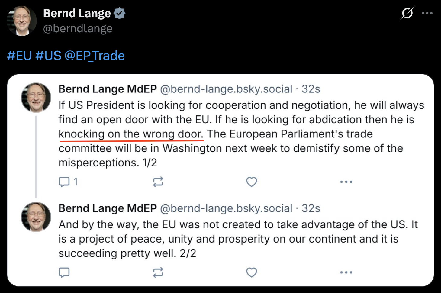 “如果美國(guó)尋求合作與談判,歐盟總是愿意敞開大門;但如果只是想讓我們照單全收美方的要求,那它就是敲錯(cuò)了門?!?/p>