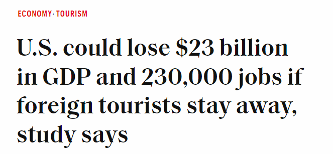 經(jīng)濟(jì)分析公司Implan首席經(jīng)濟(jì)學(xué)家珍妮弗·索瓦爾德森(Jennifer Thorvaldson)測(cè)算稱,基于3月份外國(guó)游客赴美人數(shù)下降的情況,若今年國(guó)際游客減少10%,不僅美國(guó)國(guó)內(nèi)生產(chǎn)總值(GDP)將損失230億美元,還會(huì)損失大約23萬個(gè)工作崗位。