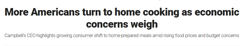 福克斯財(cái)經(jīng)(Fox Business)的報(bào)道援引了罐頭食品生產(chǎn)商金寶湯(Campbell's)首席執(zhí)行官米克·比克胡伊森的話稱,隨著經(jīng)濟(jì)擔(dān)憂加劇,更多美國(guó)家庭選擇在家烹飪以節(jié)省開支。他近期在其公司第三季度財(cái)報(bào)電話會(huì)議上告訴分析師,整個(gè)季度消費(fèi)者情緒持續(xù)疲軟,購(gòu)物者在食品支出上變得更加謹(jǐn)慎。