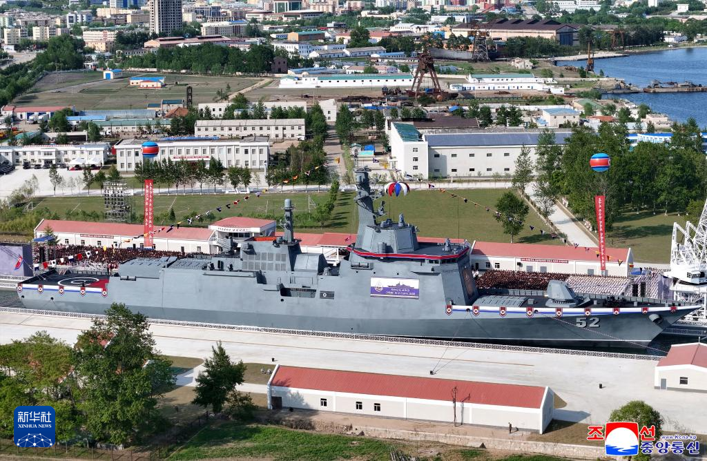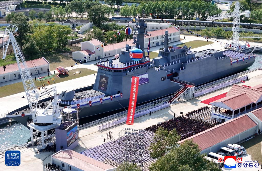 這是朝中社發(fā)布的朝鮮“崔賢”級二號艦下水儀式現場畫面。新華社/朝中社