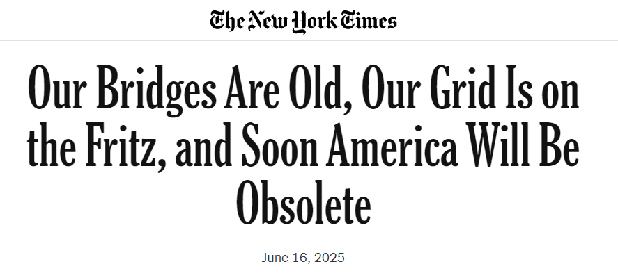 《紐約時報》6月16日刊發(fā)專欄文章稱,美國的橋梁、電網(wǎng)和港口等基礎(chǔ)設(shè)施正面臨嚴重的老化與不足,美國即將被“老化淘汰”。
