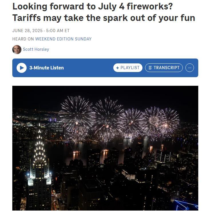 美國全國公共廣播電臺網(wǎng)站近日發(fā)表一篇文章說,美國人即將迎來獨立日慶典,燒烤派對、節(jié)日游行和煙花表演自然是重頭戲。但受特朗普政府加征關(guān)稅影響,今年煙花價格可能飆升,供應(yīng)也將更加緊俏。這是因為,美國用于慶祝獨立日的火箭煙花、手持電光花和噴泉禮花,幾乎完全依賴中國供應(yīng)——而早在一千多年前,正是中國人發(fā)明了煙花。