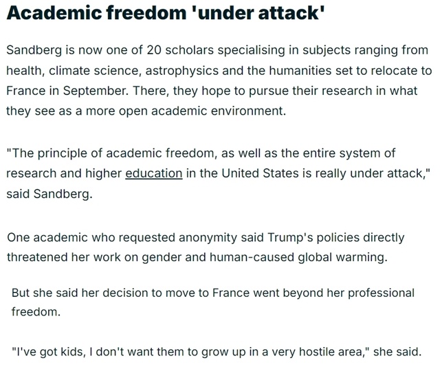 還有一位女學(xué)者告訴媒體,美國(guó)現(xiàn)政府的政策直接威脅到她有關(guān)氣候變暖等方面的研究工作,她搬到法國(guó)不僅是為了學(xué)術(shù)自由,還是因?yàn)椴幌胱屪约旱暮⒆印霸谝粋€(gè)充滿敵意的地方長(zhǎng)大”。