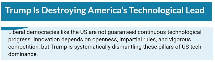 文章稱,研究機(jī)構(gòu)、人才、資金等一直是支撐美國(guó)創(chuàng)新發(fā)展的重要支柱,而美國(guó)現(xiàn)政府正在系統(tǒng)性地拆除這些支柱,斷送自己的科技領(lǐng)先地位。
