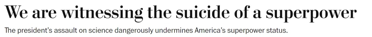 《華盛頓郵報(bào)》也刊文警告,美國(guó)現(xiàn)政府一直宣稱要讓美國(guó)“再次偉大”,但如今它卻正在對(duì)美國(guó)實(shí)力的真正來(lái)源——包括對(duì)科學(xué)研究的長(zhǎng)期投資——造成嚴(yán)重的且可能無(wú)法彌補(bǔ)的損害。
