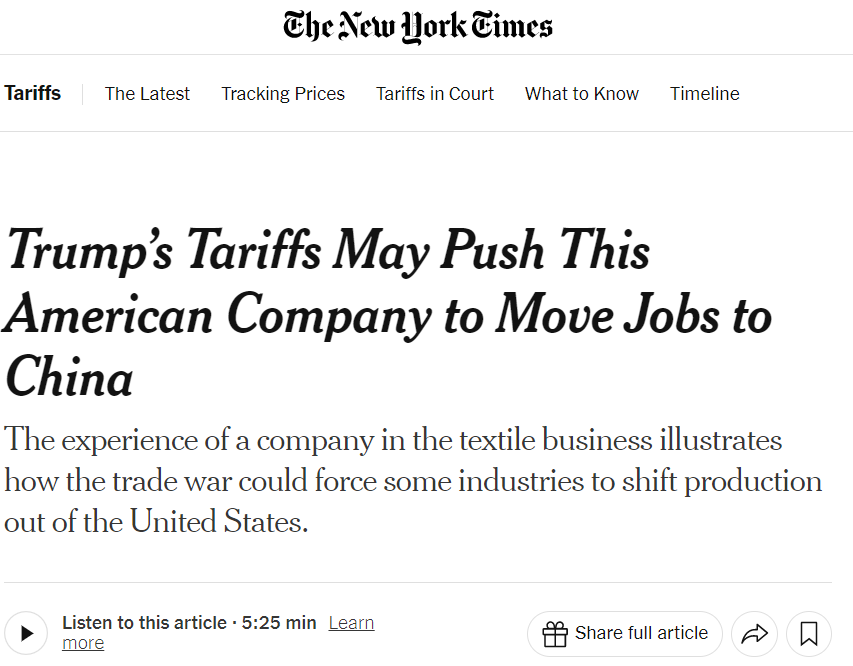文章說(shuō),特朗普政府發(fā)起的全球貿(mào)易戰(zhàn)動(dòng)搖了Cocona Labs公司的經(jīng)濟(jì)基礎(chǔ)。受到美國(guó)關(guān)稅不確定性的影響,加之中國(guó)實(shí)施的對(duì)等反制措施,這家美國(guó)公司將開(kāi)始做出改變:將其核心產(chǎn)品的部分生產(chǎn)從美國(guó)轉(zhuǎn)移到中國(guó)的工廠生產(chǎn)。