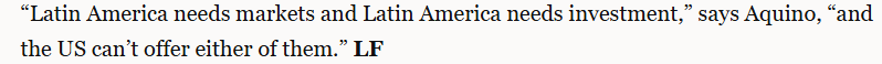 文章指出,并非所有人都對拉美與中國之間的合作感到滿意。華盛頓尤其擔心。不過,許多人認為華盛頓影響拉丁美洲的能力有限。文章援引利馬國立圣馬科斯大學的亞洲經濟專家卡洛斯·阿基諾的話指出,“拉丁美洲需要市場和投資,但美國無法提供其中任何一項”。