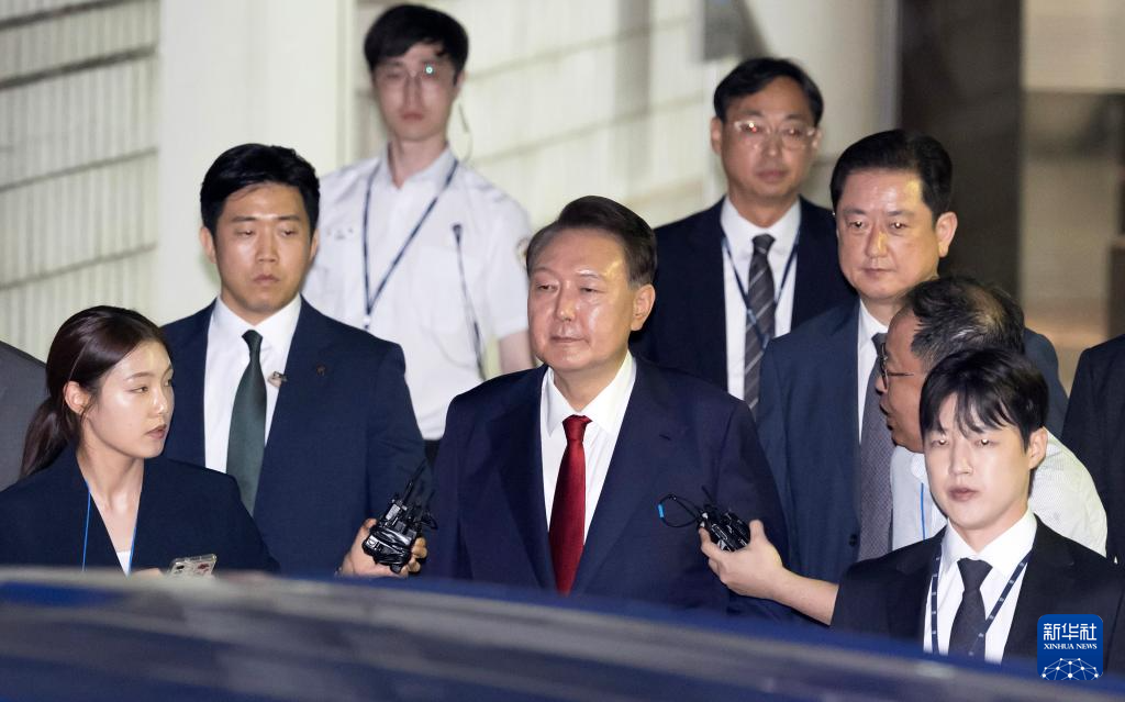 7月9日晚,韓國(guó)前總統(tǒng)尹錫悅接受訊問后走出首爾中央地方法院。新華社/紐西斯通訊社