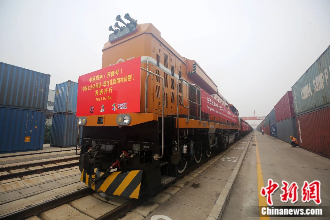 2021年7月5日, 中國—上海合作組織地方經(jīng)貿(mào)合作示范區(qū)(簡稱“上合示范區(qū)”)前往塔吉克斯坦首都杜尚別的首班中歐班列(齊魯號(hào))“上合快線”發(fā)出,從上合示范區(qū)青島多式聯(lián)運(yùn)中心啟程。中新社記者 胡耀杰 攝