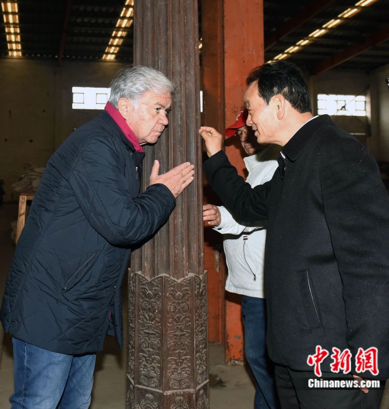 2018年11月7日,拉希德·阿利莫夫(左一)作為時(shí)任上合組織秘書長,來到安徽蚌埠“湖上升明月”中華古民居博覽園參觀考察。圖為拉希德·阿利莫夫在細(xì)細(xì)傾聽來自敲打老木頭的聲音。中新社發(fā) 鐘欣 攝