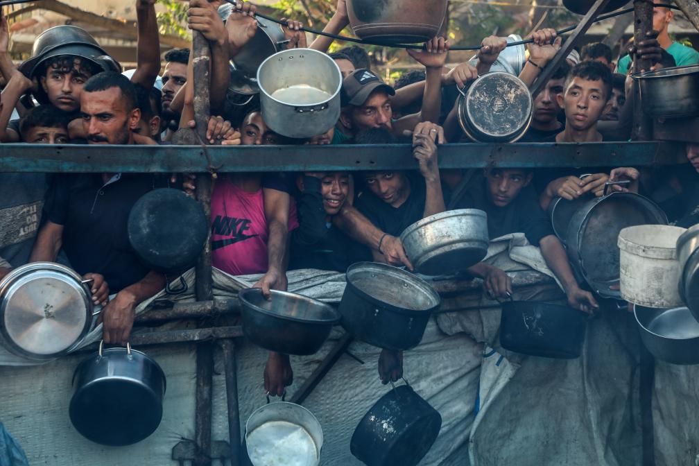 7月20日,在加沙城,當地民眾等待領取食物。新華社發(fā)(里澤克·阿卜杜勒賈瓦德攝)