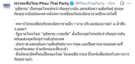 泰國執(zhí)政黨為泰黨23日發(fā)布聲明表示,一名泰國士兵當(dāng)天在泰柬邊境觸發(fā)地雷而受傷,泰方因而決定降低雙方的外交關(guān)系等級。按照泰國外交部的說法,致泰國士兵受傷的地雷系柬方新布設(shè),泰方已就此向柬方提出正式抗議。
