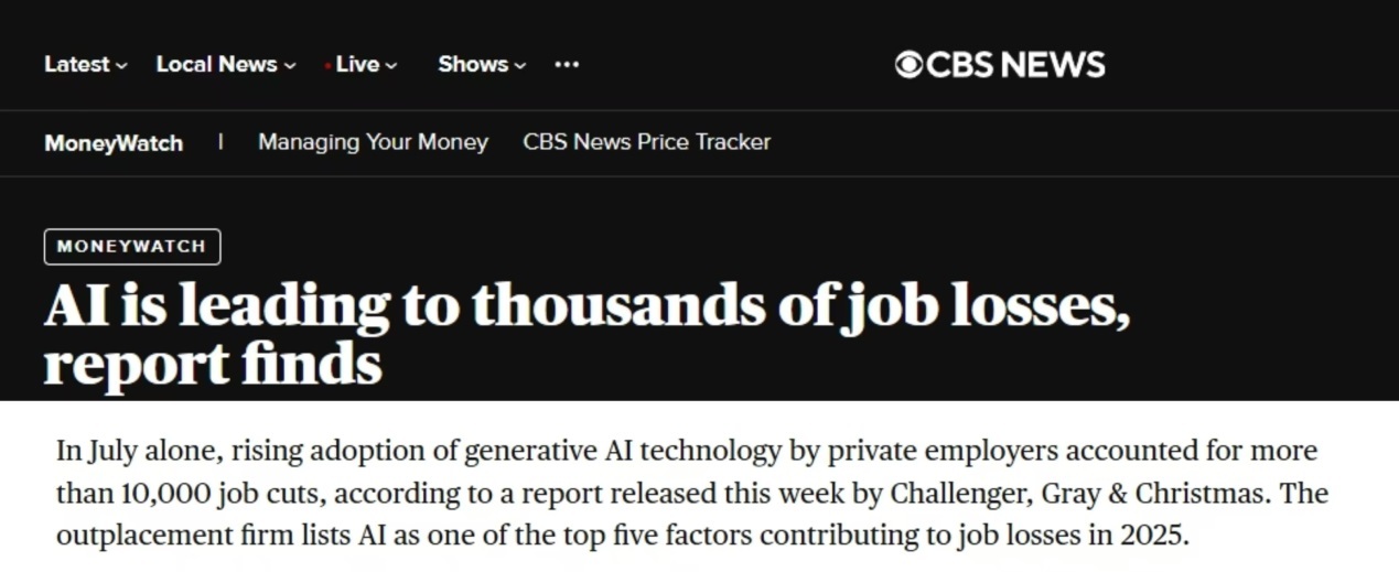 美國哥倫比亞廣播公司刊發(fā)的一篇報道認為,人工智能(AI)技術已成為美國企業(yè)今年崗位流失的五大主因之一。報道說,自2023年以來,超2.7萬個崗位直接因AI興起被取代,僅今年7月,美國私營企業(yè)因加速采用AI技術,已裁撤超1萬個工作崗位。