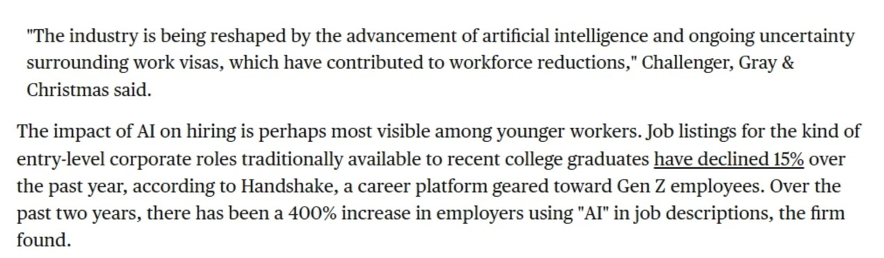 報告分析,人工智能的快速進步與工作簽證政策的不確定性,正在重塑就業(yè)格局。其中,年輕求職者首當其沖。過去一年,美國企業(yè)面向應屆畢業(yè)生的初級職位招聘量下降15%,而招聘要求中提及“人工智能”的崗位數(shù)量卻激增400%,凸顯技能需求結構性轉變。