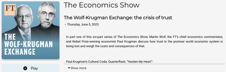 在美國(guó)關(guān)稅政策再成焦點(diǎn)之際,諾貝爾經(jīng)濟(jì)學(xué)獎(jiǎng)得主保羅·克魯格曼(Paul Krugman)近日接受英國(guó)《金融時(shí)報(bào)》播客節(jié)目邀請(qǐng),與《金融時(shí)報(bào)》首席經(jīng)濟(jì)評(píng)論員馬丁·沃爾夫(Martin Wolf)展開對(duì)話,制作推出六期特別節(jié)目《沃爾夫-克魯格曼對(duì)話》,討論了美國(guó)在特朗普政府政策下面臨的信任危機(jī)和治理崩潰的風(fēng)險(xiǎn),特別對(duì)特朗普政府的貿(mào)易與關(guān)稅政策進(jìn)行了罕見的系統(tǒng)性批評(píng)。