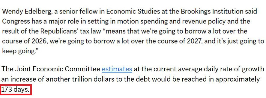 在美國布魯金斯學(xué)會(huì)高級(jí)研究員溫迪·埃德爾伯格看來,共和黨稅法的出臺(tái)“意味著我們將在2026年借很多錢,在2027年還要借很多錢,而且會(huì)繼續(xù)借下去”。