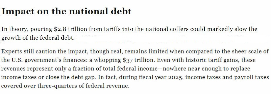 雖然美國政府確實(shí)從其濫施的關(guān)稅中“賺”了一筆,但專家們?nèi)匀痪嬷赋?,與37萬億美元的龐大美債規(guī)模相比,關(guān)稅收入實(shí)屬九牛一毛。即使加上歷史上的關(guān)稅收益,它們也只占聯(lián)邦總收入的一小部分,遠(yuǎn)不足以取代所得稅或縮小債務(wù)缺口。
