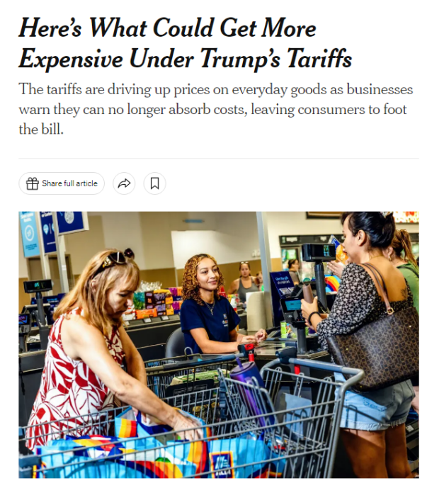 美國政府此前公布的經過調整的“對等關稅”已經生效,美數(shù)十個貿易伙伴將被征收10%至41%不等的關稅,隨之而來的便是被關稅推高的物價。美國《紐約時報》刊文稱,美國消費者或許很快就會發(fā)現(xiàn),大到汽車,小到一雙鞋和一根香蕉,幾乎所有商品的售價都會上漲。