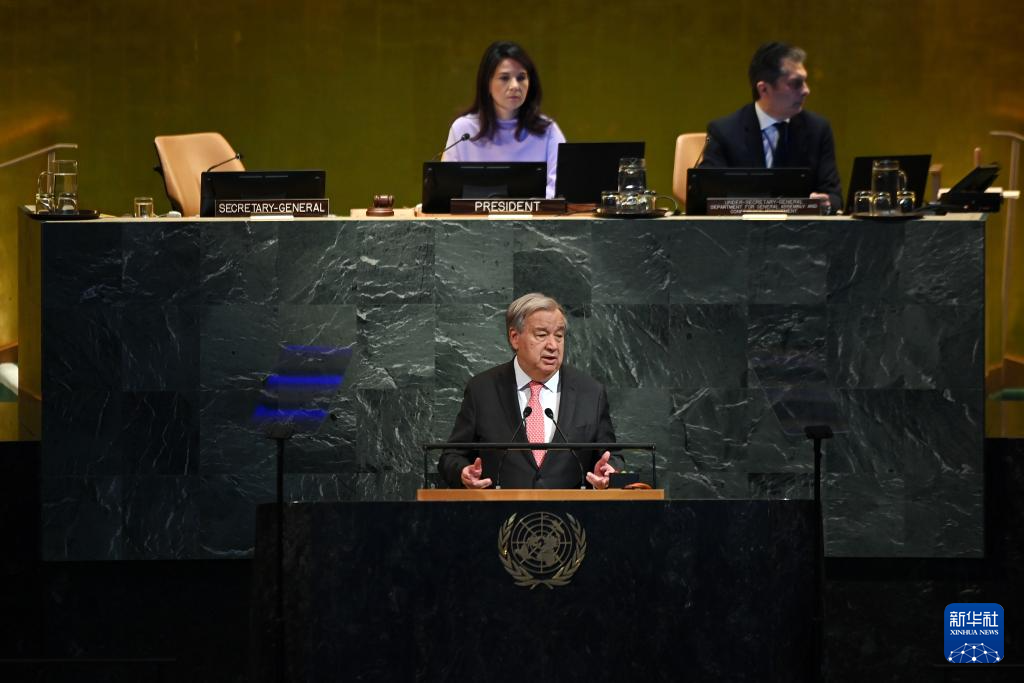 9月22日,在位于紐約的聯(lián)合國(guó)總部,聯(lián)合國(guó)秘書長(zhǎng)安東尼奧·古特雷斯(前)在紀(jì)念聯(lián)合國(guó)成立80周年高級(jí)別會(huì)議上講話。新華社記者 李睿 攝