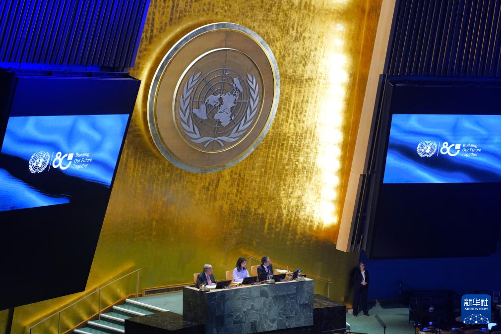 這是9月22日在位于紐約的聯(lián)合國(guó)總部拍攝的紀(jì)念聯(lián)合國(guó)成立80周年高級(jí)別會(huì)議現(xiàn)場(chǎng)。新華社記者 吳曉凌 攝