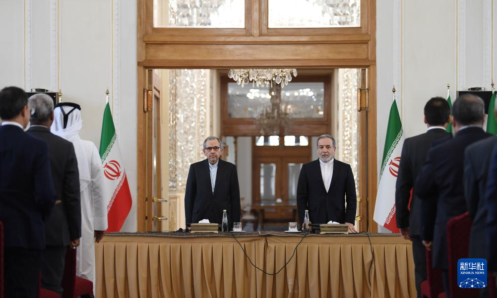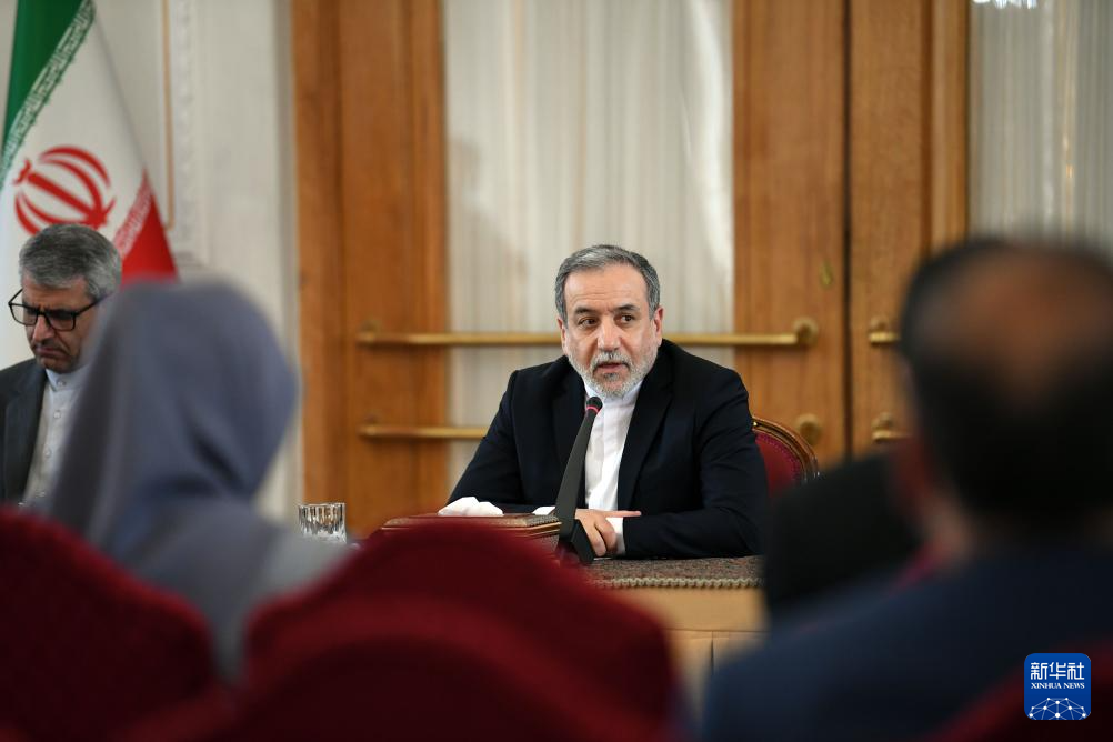 10月5日,在伊朗首都德黑蘭,伊朗外交部長阿拉格齊(右)出席與多國駐伊朗外交人員舉行的會議。新華社記者 沙達(dá)提 攝