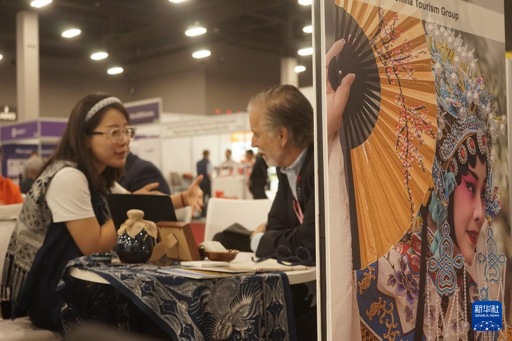10月8日,在美國拉斯維加斯,參觀者在2025年美國國際會(huì)議與獎(jiǎng)勵(lì)旅游展的中國展區(qū)傾聽講解。 新華社發(fā)(曾慧攝)