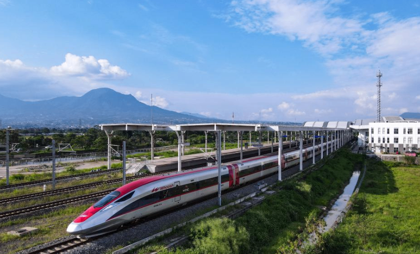 5月20日,在印度尼西亞萬隆,一列雅萬高鐵高速動車組列車駛出德卡魯爾站(無人機(jī)照片)。新華社記者 徐欽 攝
