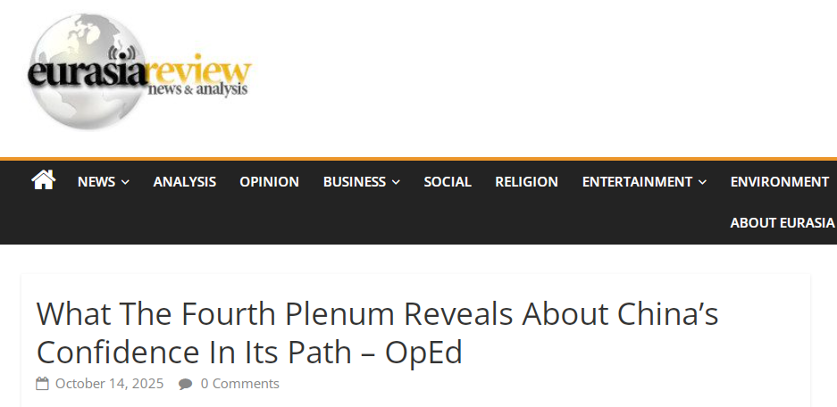 《歐亞評(píng)論》(Eurasia Review)網(wǎng)站題為《四中全會(huì)展示中國道路自信》的文章指出,中共二十屆四中全會(huì)的召開釋放出最鮮明信號(hào),面對(duì)全球經(jīng)濟(jì)不確定性加劇的背景,中國依然展現(xiàn)出對(duì)自身發(fā)展道路的信心與戰(zhàn)略定力。