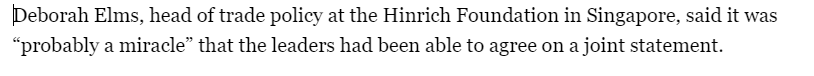 半島電視臺(tái)也關(guān)注了此次峰會(huì),報(bào)道援引新加坡欣里奇基金會(huì)貿(mào)易政策負(fù)責(zé)人黛博拉 埃爾姆斯的話說,各成員領(lǐng)導(dǎo)人能夠就聯(lián)合聲明達(dá)成一致是“了不起的事情”。他說,鑒于亞太經(jīng)合組織經(jīng)濟(jì)體的不同立場,要將任何達(dá)成一致的措辭寫入文件都是一項(xiàng)“充滿挑戰(zhàn)的工作”。