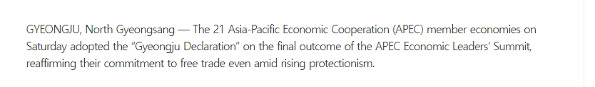 韓國《中央日報(bào)》報(bào)道稱,《慶州宣言》反映出此次APEC領(lǐng)導(dǎo)人峰會(huì)的最終成果,并重申了在保護(hù)主義抬頭 的背景下,各成員領(lǐng)導(dǎo)人對(duì)自由貿(mào)易的承諾。
