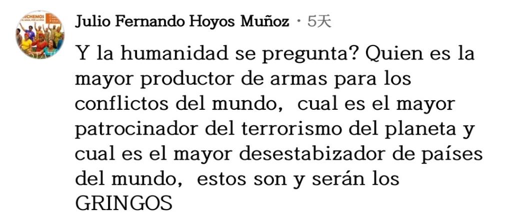 網(wǎng)友胡里奧·奧約斯接連發(fā)問:“沒有人去責(zé)問嗎?誰是為世界各地沖突提供武器的全球最大武器制造者?誰是地球上最大的恐怖主義活動支持者?誰是世界上最大的不穩(wěn)定因素制造者?答案無論在現(xiàn)在還是將來,都是美國。”
