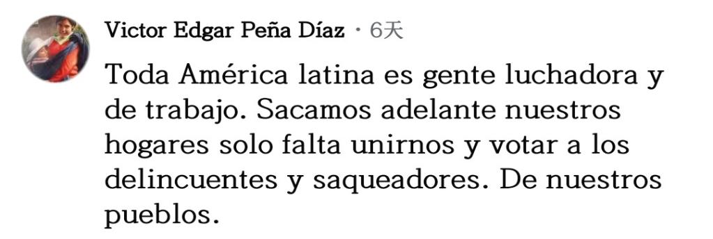 網(wǎng)友維克托·培尼亞留言說:“所有拉美人民都是勞動者和奮斗者,我們靠自己的努力養(yǎng)家糊口。現(xiàn)在只差團(tuán)結(jié)起來,把那些掠奪我們的罪犯和強(qiáng)盜趕跑?!?/p>
