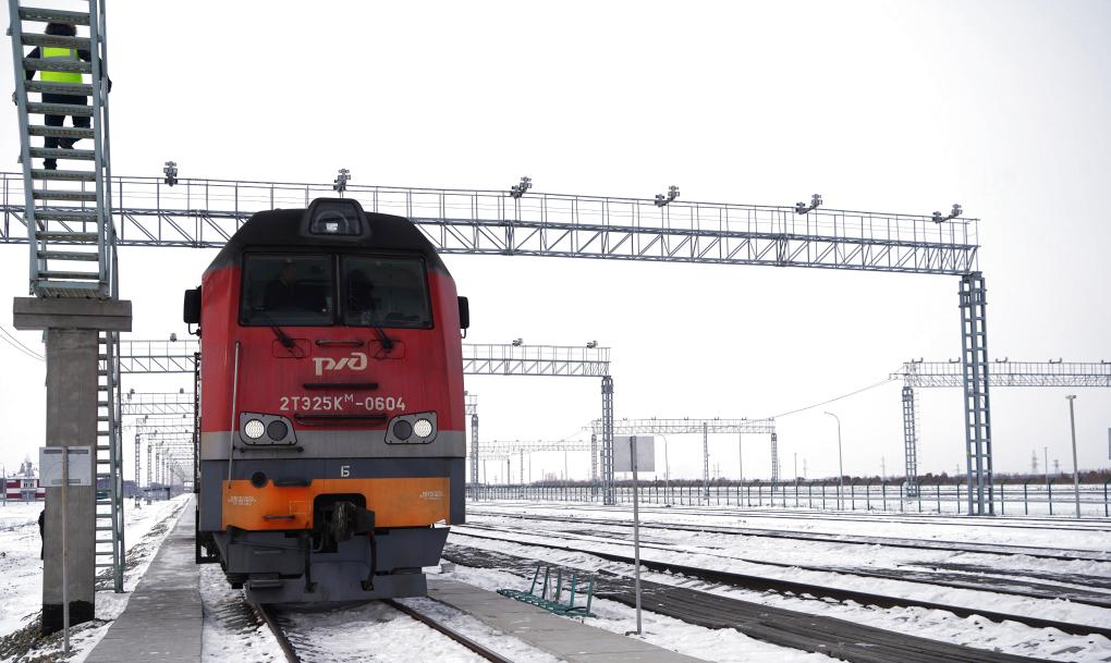 2025年12月6日,一輛即將開往中國(guó)的俄羅斯貨運(yùn)列車停靠在俄羅斯下列寧斯闊耶鐵路口岸。新華社記者劉愷攝