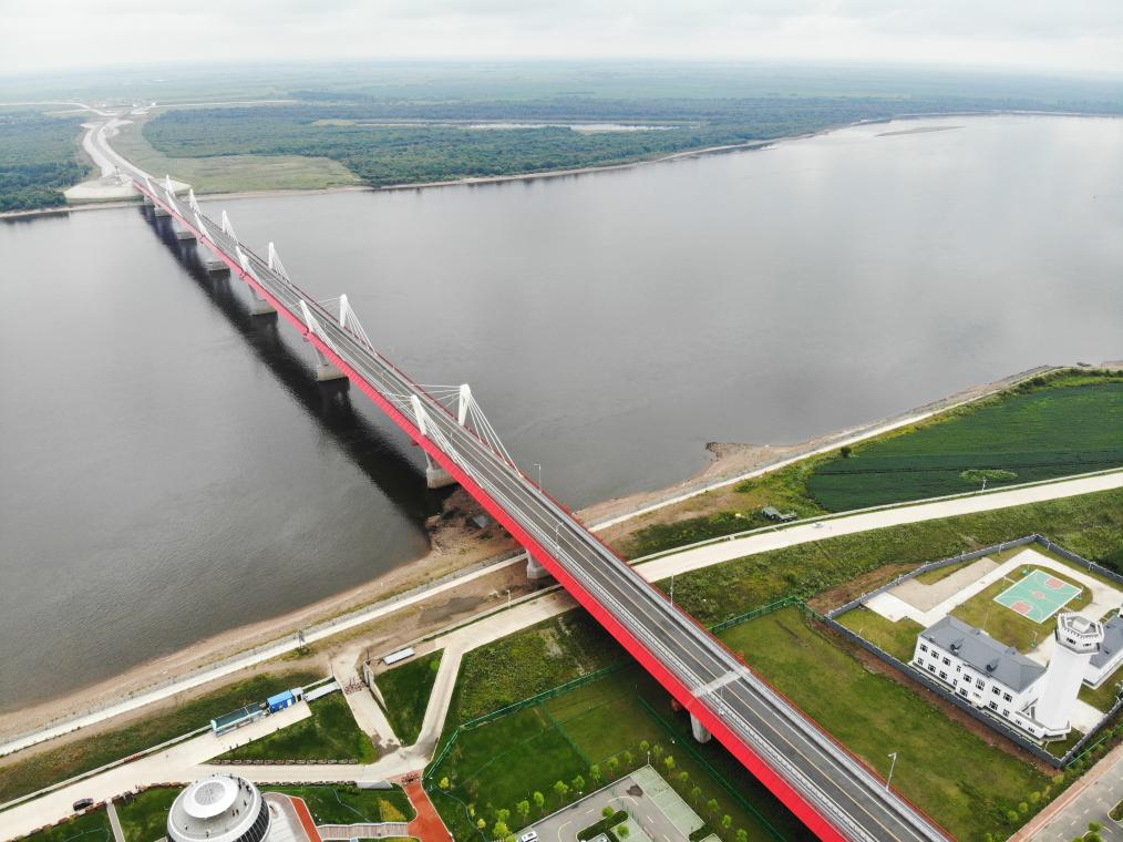 這是2023年8月11日在中國(guó)黑河一側(cè)拍攝的黑河-布拉戈維申斯克公路橋(無人機(jī)照片)。新華社記者王松攝