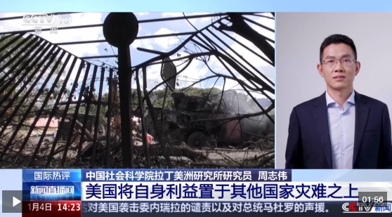 中國社會科學院拉丁美洲研究所研究員 周志偉:從這次行動的實質(zhì)來看的話,體現(xiàn)出美國霸權行徑挑戰(zhàn)國際法,挑戰(zhàn)國際關系的準則,將美國的利益置于其他國家的災難之上。我覺得這件事是對國際法的野蠻踐踏,將進一步加劇國際社會對于美國的不信任感。