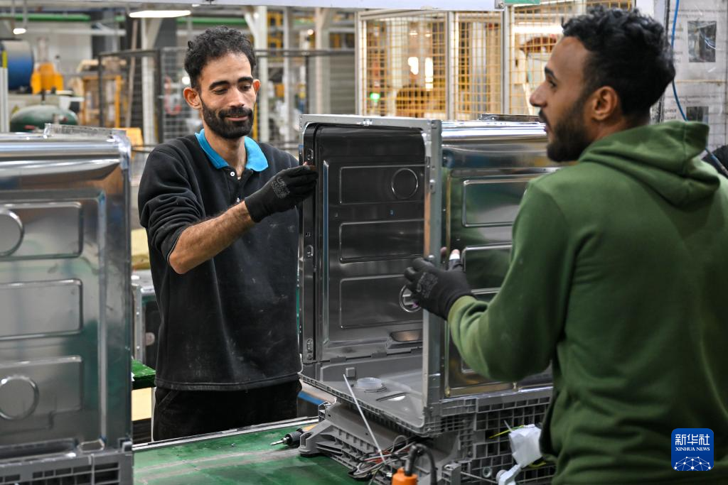1月19日,在埃及蘇赫奈泉的中?!ぬ┻_(dá)蘇伊士經(jīng)貿(mào)合作區(qū),埃及員工在美的埃及廚房和熱水器有限公司洗碗機(jī)生產(chǎn)車間組裝洗碗機(jī)。新華社記者 辛夢(mèng)晨 攝