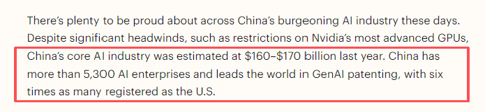 《時代》周刊的文章以中國人工智能實體企業(yè)從業(yè)人員的經(jīng)歷為切入口,稱自豪感正蔓延至中國蓬勃發(fā)展的AI產(chǎn)業(yè)。2025年中國核心AI產(chǎn)業(yè)規(guī)模達1600-1700億美元。數(shù)據(jù)顯示,中國擁有5300余家AI企業(yè),其生成式AI專利數(shù)量是美國的6倍。