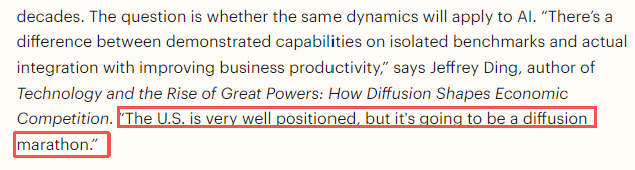正如科技史著作《科技與大國崛起》的作者杰弗里·丁所言:“基準(zhǔn)測試表現(xiàn)與實際生產(chǎn)力提升是兩回事。盡管美國現(xiàn)在的位置不錯,但是這是一場持久的馬拉松?!?/p>