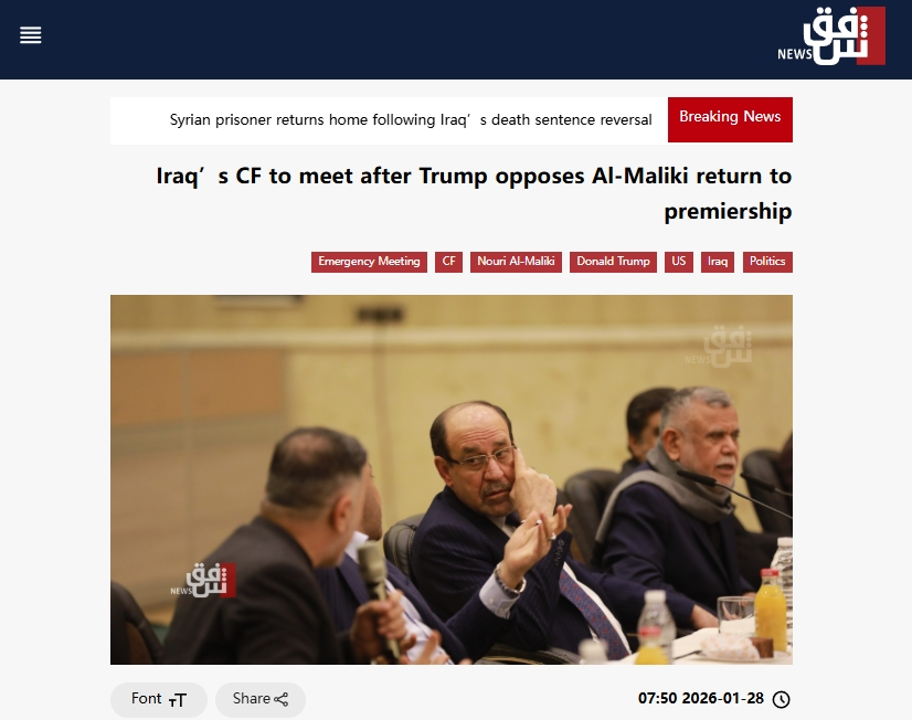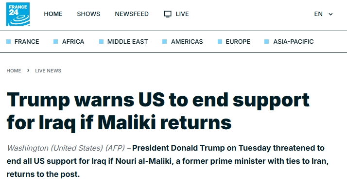 美國總統(tǒng)特朗普當?shù)貢r間1月27日在社交媒體發(fā)文稱,如果伊拉克前總理努里·馬利基再度當選總理,美國將不再“援助”伊拉克。
