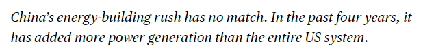 文章說,中國的能源建設速度無與倫比。過去四年,中國新增的發(fā)電容量超過了整個美國電力系統(tǒng)的總和。這種大規(guī)模能源基礎設施投資幫助中國降低對化石燃料依賴,為人工智能數(shù)據(jù)中心等高耗能技術提供穩(wěn)定電力供應,從而在全球科技競爭中獲得顯著優(yōu)勢。