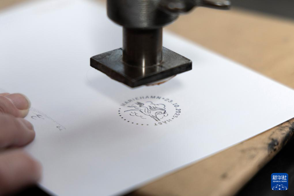 1月21日,在位于芬蘭奧蘭群島自治區(qū)首府瑪麗港市的奧蘭群島郵政署總部,工作人員為一張明信片蓋上馬年生肖主題印章。新華社發(fā)(馬蒂·馬蒂凱寧攝)
