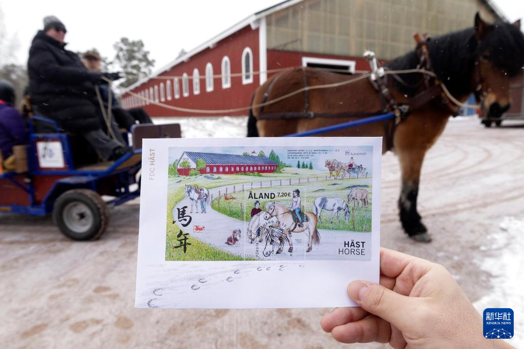 這是1月21日在芬蘭奧蘭群島自治區(qū)首府瑪麗港市附近一處馬場拍攝的馬年生肖主題郵票。新華社發(fā)(馬蒂·馬蒂凱寧攝)