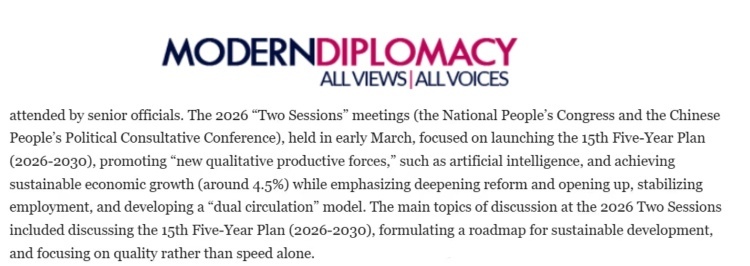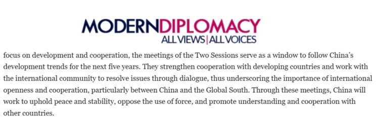 歐洲《現(xiàn)代外交》網(wǎng)站近日刊登埃及本尼蘇伊夫大學(xué)副教授納迪亞·赫爾米博士的評論文章稱,今年中國兩會重點關(guān)注發(fā)展模式創(chuàng)新與深化伙伴關(guān)系。會議議題包括通過共建“一帶一路”倡議推動“高質(zhì)量發(fā)展”,深化數(shù)字經(jīng)濟、基礎(chǔ)設(shè)施及能源領(lǐng)域的國際合作,為推動構(gòu)建人類命運共同體提供重要平臺。